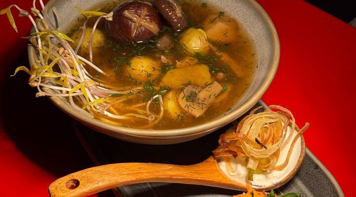 Первые блюда представят щи-рамен и грибовница с шимеджи и шиитаке, а в качестве основного горячего в коми-пермяцком спешиале появятся печеный в костре картофель с грибами и грибным чаем, турецкий пиде с лесными грибами, ляшки с телячьими щечками. Десерты тоже будут, например, ячменная тарталетка с деревенским творогом, черемуховые блины с малиной, конфета из лесных ягод, из напитков предложат сур или травяной чай с банкой варенья.