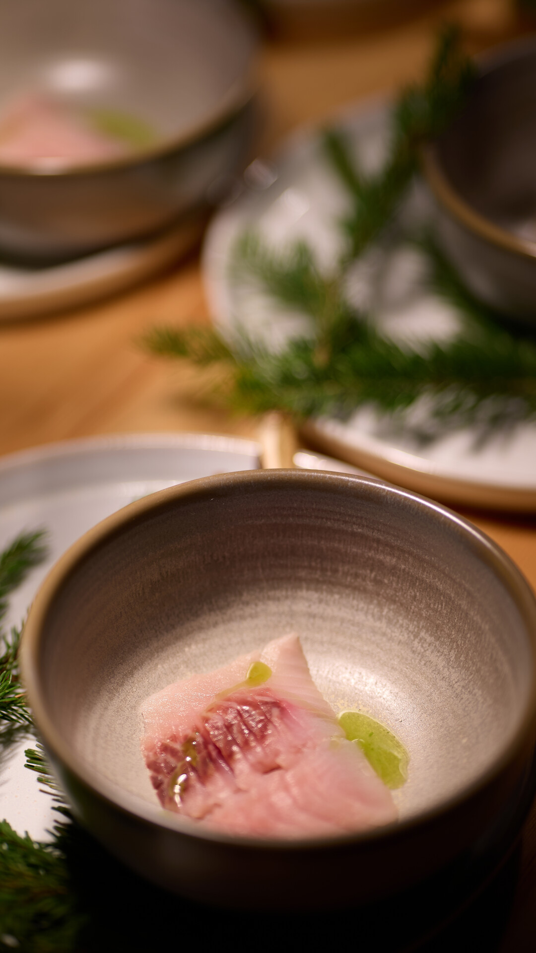 Мой фаворит в меню — муксун, замаринованный в еловых иголках и соли. Подается рыба с соусом на основе хрена и сметаны — очень необычный и приятный вкус. На закуску также попробуйте бриошь с паштетом из зайца.