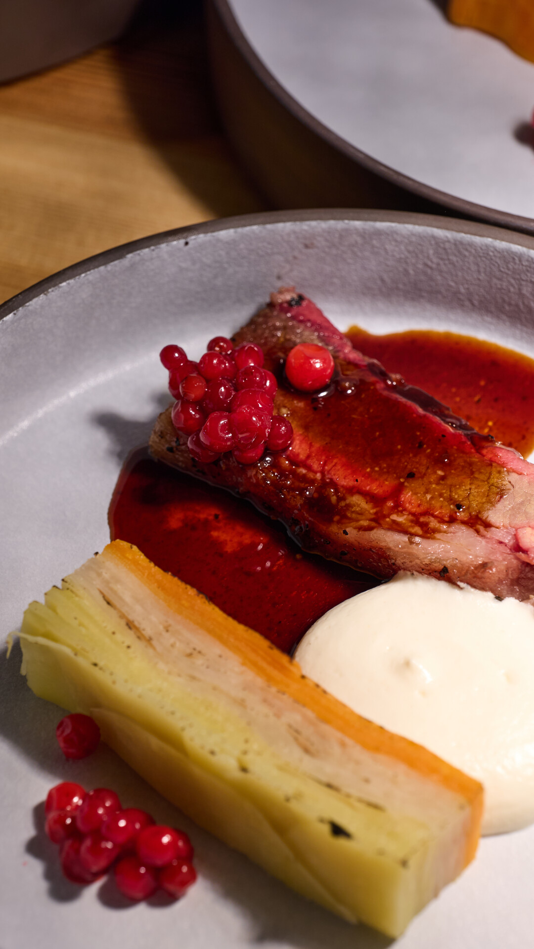 Если выбирать из горячего, то советую обратить внимание на копченого налима, глазированного квасным суслом, и говяжью грудину, которую мы томим в дровяной печи и подаем с гратеном из корнеплодов и моченой брусникой.