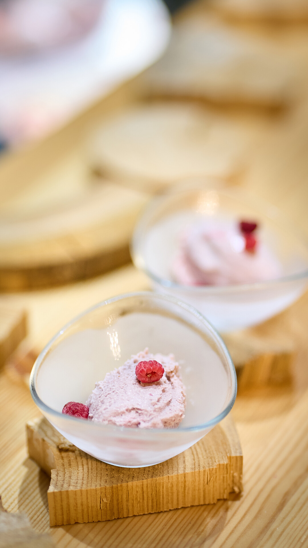 В завершение ужина обязательно попробуйте десерт — сливочную сдобу с сырным кремом и лесной малиной, запеченной в печи. Малину собрали сами, а после заморозили, поэтому блюдо будет представлено в меню, пока не закончатся ягоды — успевайте попробовать!