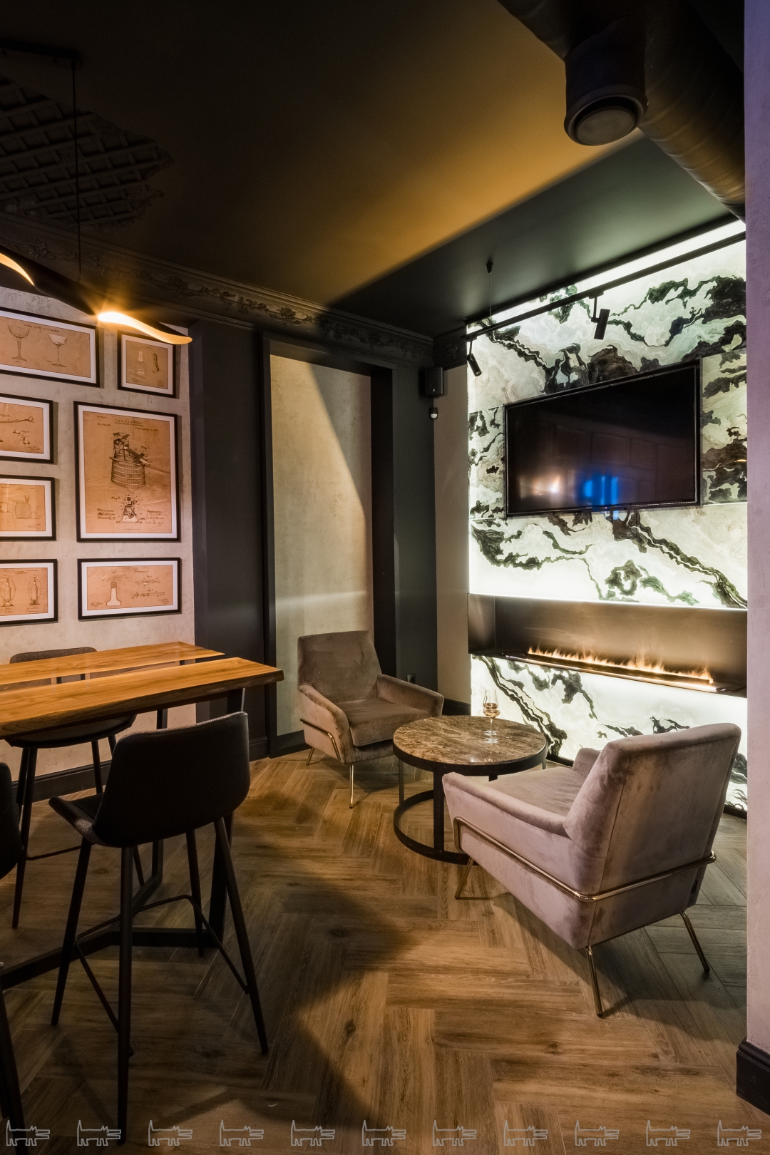 Здесь можно посидеть большой компанией или занять столик на двоих прямо около камина. Тут нет живого огня, но есть красивая имитация из пара. Камин работает еще и как увлажнитель воздуха для комфорта гостей и сохранности произведений искусства, которые у нас выставлены на продажу. Это картины екатеринбургского художника Ильи Юсупова. Целую стену у нас занимают репродукции старых винных патентов: тут и первые разработки пробок для шампанского, и кулеры, и прессы, бокалы, штопоры, мюзле… Все это мы собирали и выбирали самостоятельно. Мне очень хочется, чтобы BRUT стал гастрономическим и культурным пространством на карте Перми.