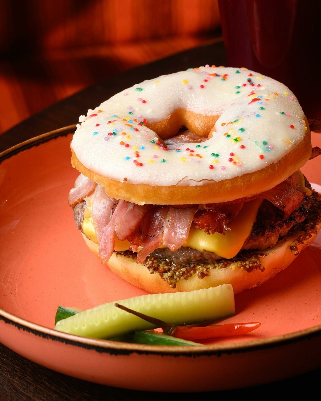 В пабе «Чеширский кот» этим летом появился понгер — бургер на пончике с глазурью (Что? Да!) с котлетой из говядины, беконом, чеддером, зернистой горчицей и острым халапеньо. Как минимум, это красиво. Но еще и вкусно, уверены.