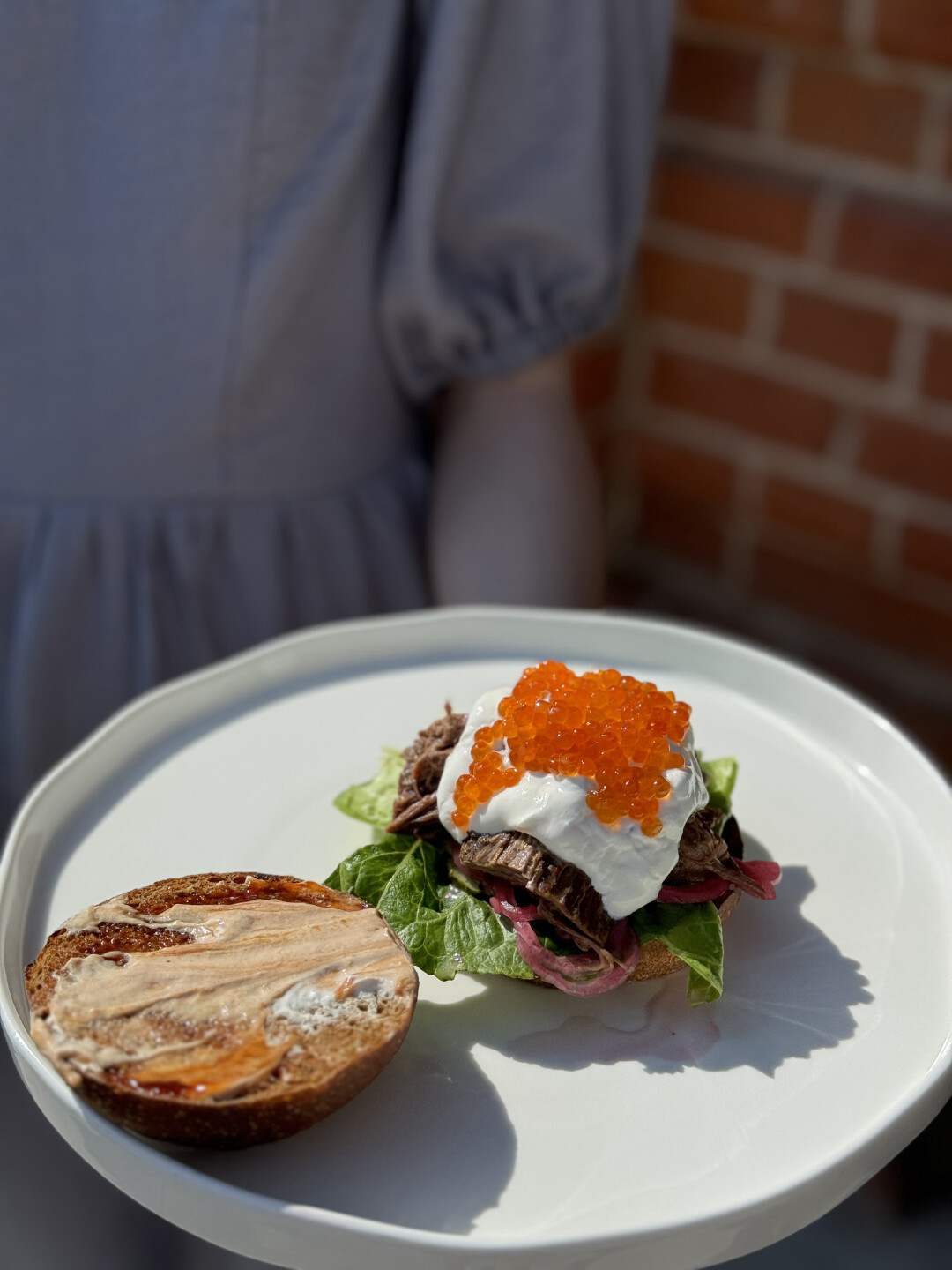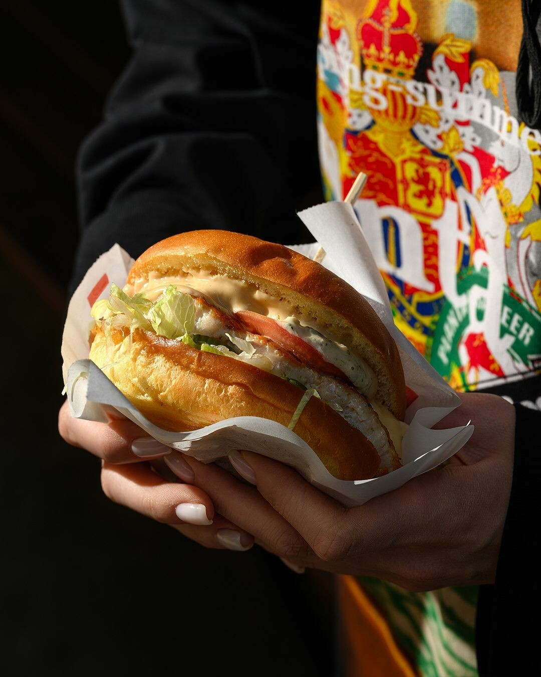 Бургер Третьяковой — вариация от одноименного ресторана русской кухни. Его готовят из ржаного хлеба, мяса лося, острых огурцов, сметаны и красной икры. Описание уже интригует, согласитесь?!
