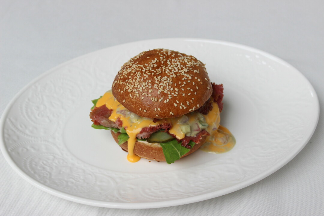 Ресторан «Гедонист» предлагает бургер с пастрами из говядины, чеддером и халапеньо. Ярко, пикантно, изысканно!