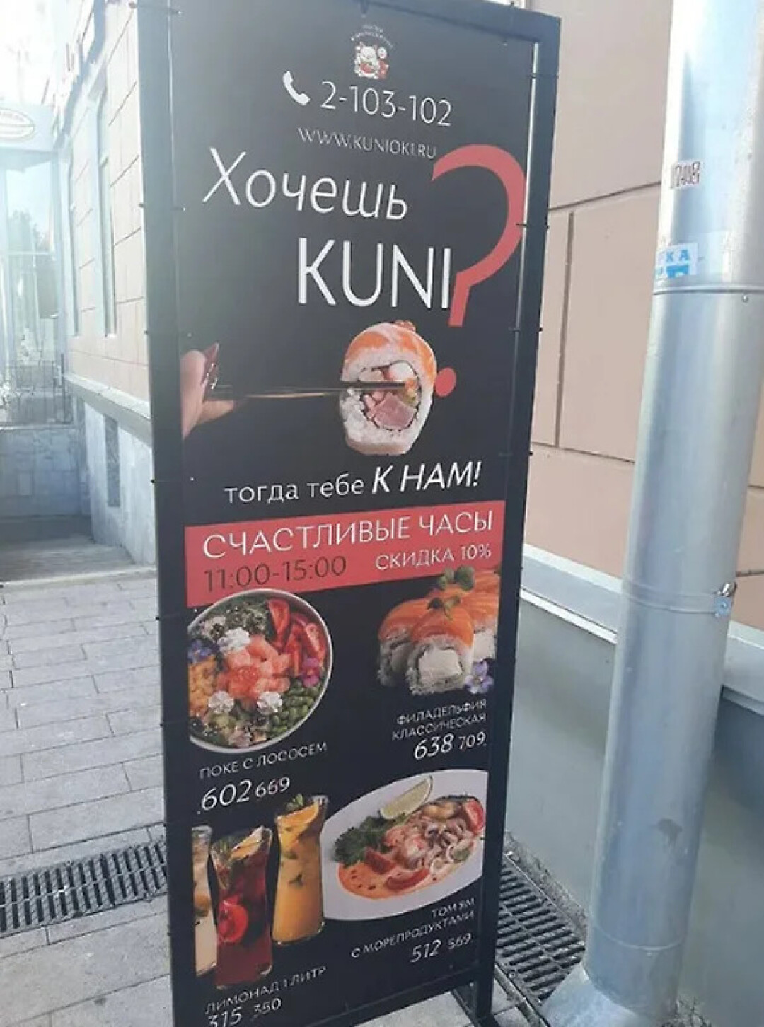 Напомним, возле KuniOki появился баннер с изображением ролла и вопроса «Хочешь?» с использованием первой части названия кафе. УФАС посчитали, что реклама вводит в заблуждение: будто в заведении кроме японской кухни посетителям предложат услуги интимного характера.