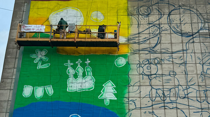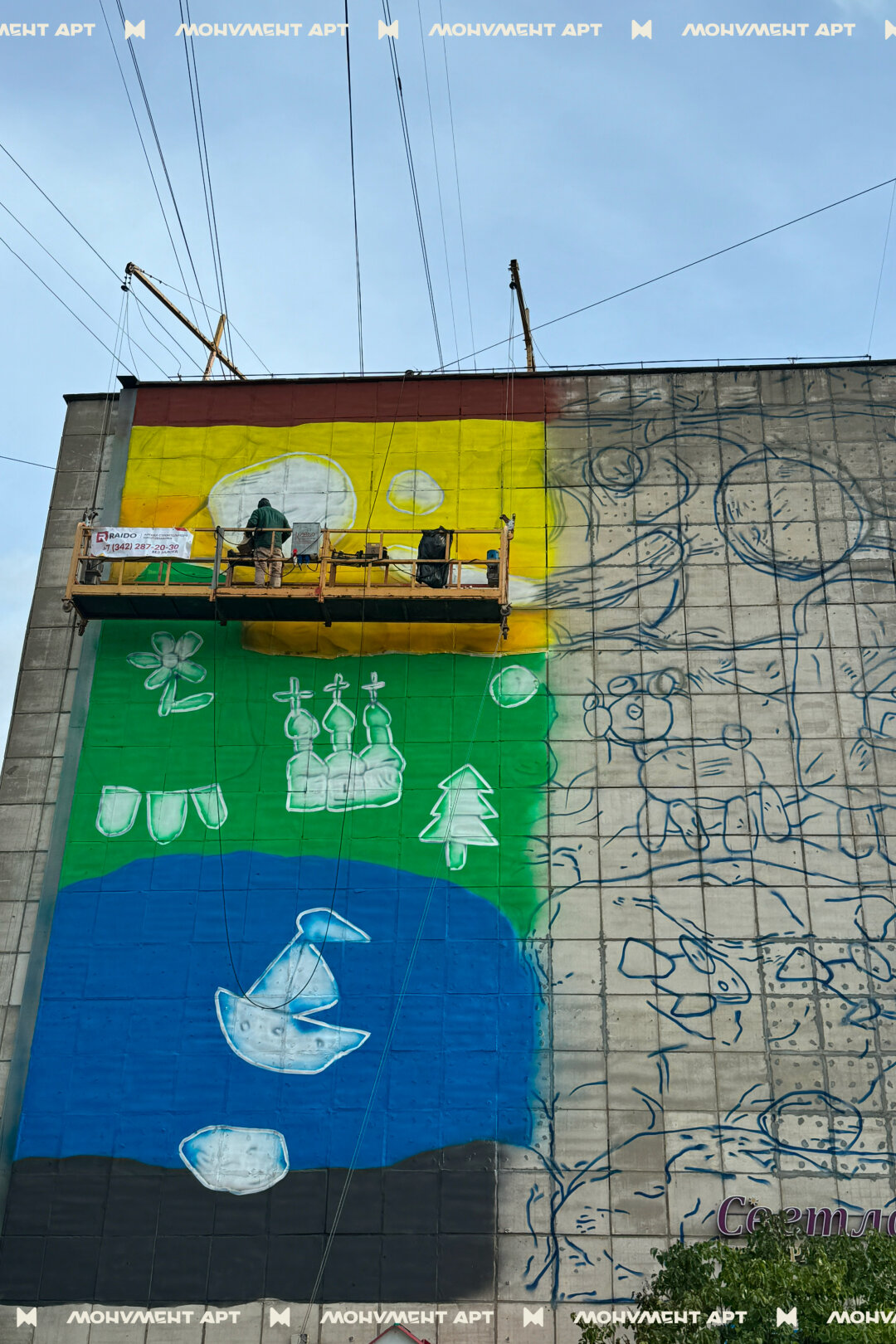 Началось создание седьмого мурала в рамках фестиваля современной городской культуры «МОНУМЕНТ АРТ». Его рисует художник Тимур Форк, который работает в технике «пластилиновый реализм».