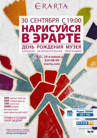 За первый год работы музей и галереи современного искусства «Эрарта» приняли около ста тысяч гостей — и именно посетителям посвящено праздничное мероприятие по случаю первого дня рождения. Вечером 30 сентября всю экспозицию музея заменят чистыми холстами, которые отдадут в распоряжение гостей праздника. Любой желающий сможет поупражняться в изобразительном творчестве в настоящем музейном пространстве. Помимо этого в программе праздника концерты музыкальных коллективов, танцы в наушниках Silent Disco, поэтические чтения, театральный марафон, парад таперов и кинопрограмма.