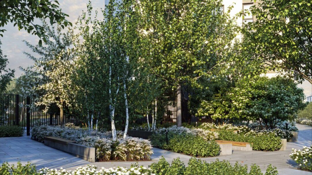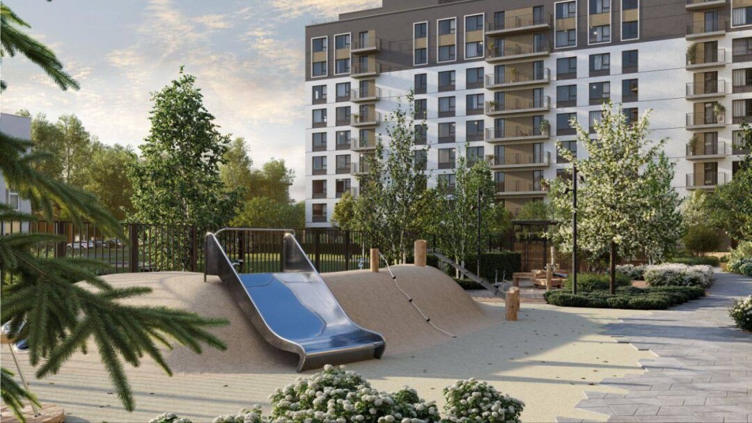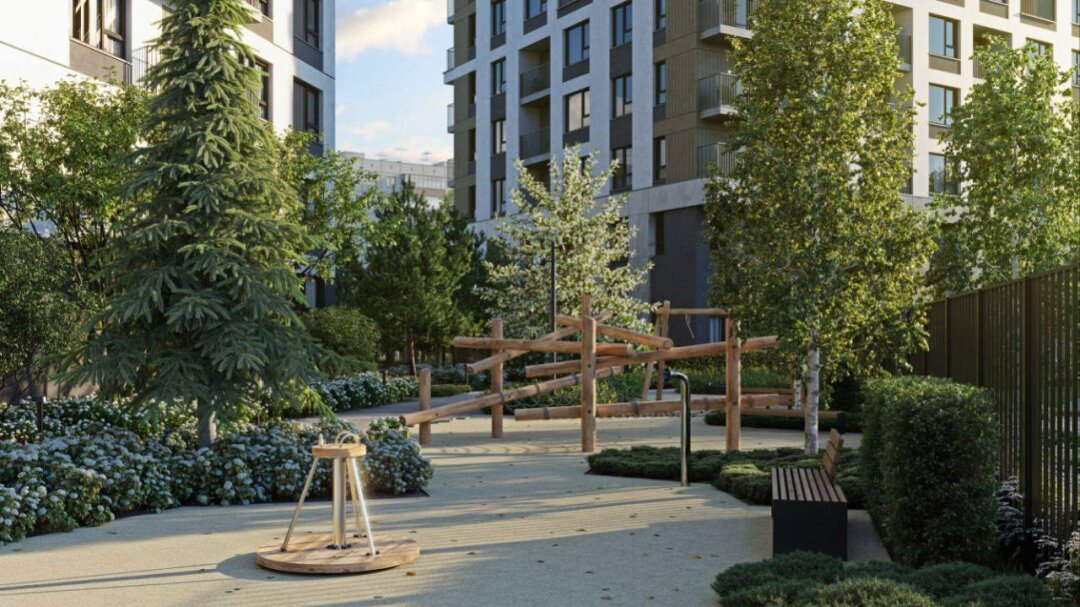 Общественные пространства у жилого комплекса собираются обустроить: входную площадь окружат зелеными насаждениями и украсят арт-объектом, который будет отражать особенность района. Будет и вторая площадь с амфитеатром и водным объектом, а во дворе жилого комплекса разместят несколько игровых площадок для разных возрастных групп, зонами тихого отдыха и спортивной площадкой.
