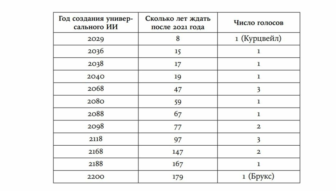 Обратите внимание, что эти прогнозы были даны в 2018 году, из-за чего в них преобладают годы, кончающиеся на 8. Например, прогноз «2038 год» может в действительности означать «через 20 лет от настоящего момента». Я почти уверен, что если бы спросил тех же специалистов высказать предположения сейчас, то получил бы такие же оценки, иначе говоря, названные даты сдвинулись бы вперед. Это заставляет опасаться, что к созданию универсального ИИ применима старая шутка физиков о термоядерном синтезе, «до овладения которым всегда остается 30 лет».