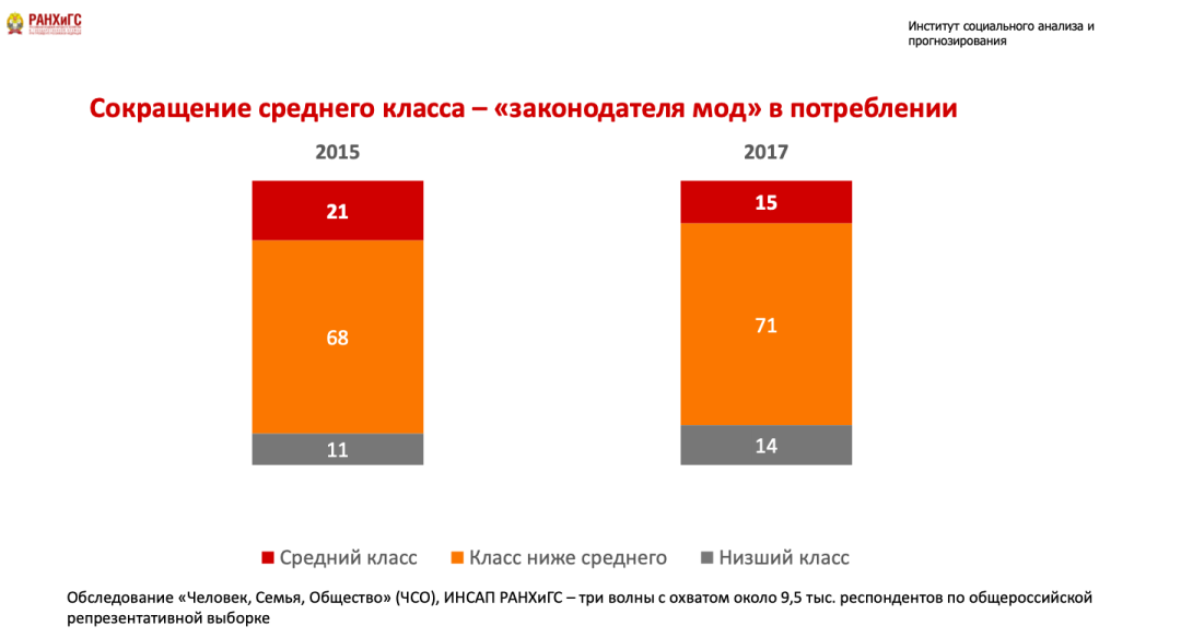 Но почему это важно? В большинстве развитых стран средний класс составляет бо́льшую часть общества и соответственно является основным потребителем, но у нас это меньше одной пятой части. Но дело в том, что у средних классов во всем мире (и мы не исключение) есть одна функция: он вырабатывает потребительские предпочтения и потребительские модели, которые потом осваиваются и перенимаются всеми слоями общества. Это такой класс-транслятор. И в этой связи драматическое его сокращение, которое произошло еще до нынешнего кризиса – это действительно плохая новость.