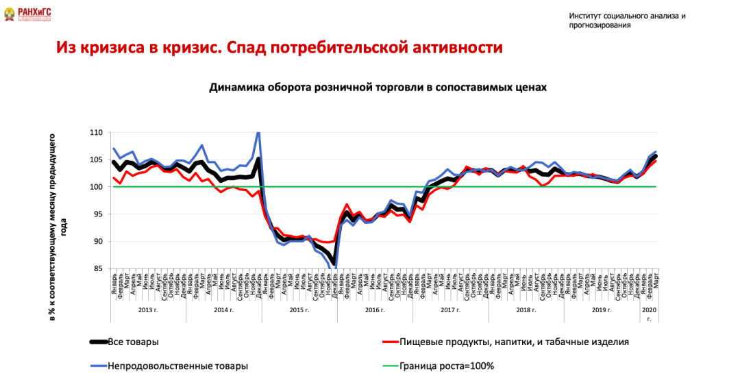 Мы будем иметь дело с многолетней моделью минимизации расходов и потребления, которая досталась нам в наследство от предыдущих периодов. Каждый год значительная доля людей была вынуждена сокращать свои расходы и отказываться от привычной модели потребления. Это результаты мониторинга, который мы, Российская академия народного хозяйства, ведем с 2015 года. Это происходит во всех социальных группах с точки зрения доходов, во всех населенных пунктах и практически во всех возрастах.