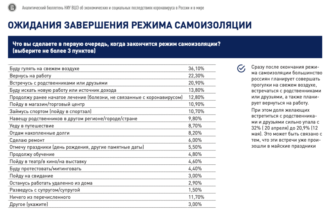 Сейчас формируются новые привычки, и часть из них будет производить тормозящие эффекты, часть – стимулирующие. Когда мы спрашивали у людей, что они будут делать, когда самоизоляция закончится, только 11% говорили, что пойдут в магазины и торговые центры. Большинство, по крайней мере в ближайшее время, туда не пойдет. А две трети опрошенных говорят, что будут с собой на работу брать еду. Я полагаю, что в таких масштабах, конечно, этого не будет, но все равно это показывает, как люди сейчас воспринимают ситуацию. Это будет усложнять восстановление экономики».