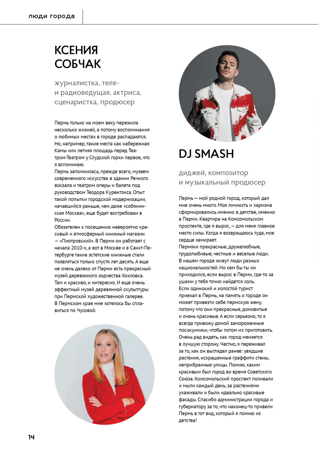 Специально для путеводителя 2023 года знаменитые люди города поделились своими любимыми местам в Перми и крае и теплыми воспоминания из детства и юности. Среди них: DJ Smash, скульптор Альфиз Сабиров, актер и режиссер Антон Богданов, лидер группы OQJAV Вадик Королев, актриса Катерина Шпица, главный тренер баскетбольного клуба БК «ПАРМА-ПАРИ» Евгений Пашутин и многие другие.