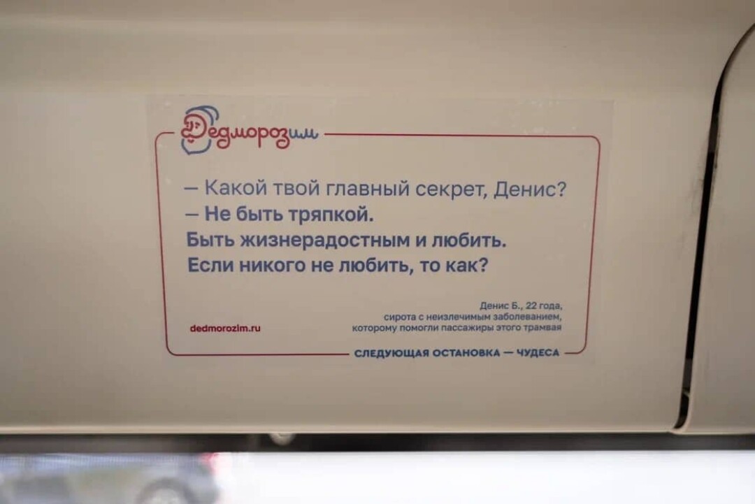 «Этих жизнеутверждающих цитат не было бы, если бы не поддержка сотен тысяч пермяков, ежедневно садящихся в городской транспорт. В каждом вагоне всегда есть хотя бы несколько человек, поддерживающих сирот и ребят с тяжелыми заболеваниями», — рассказали в «Дедморозим».