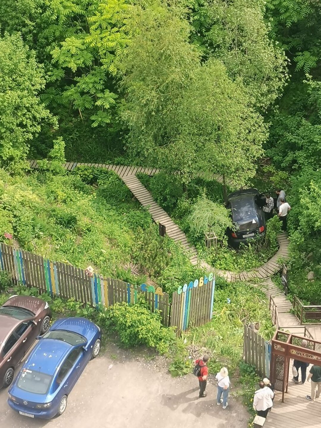 В Саду Соловьев 4 июня произошло ДТП. Hyundai Getz снес забор и въехал прямо на территорию зеленой зоны до самой реки Уинки.