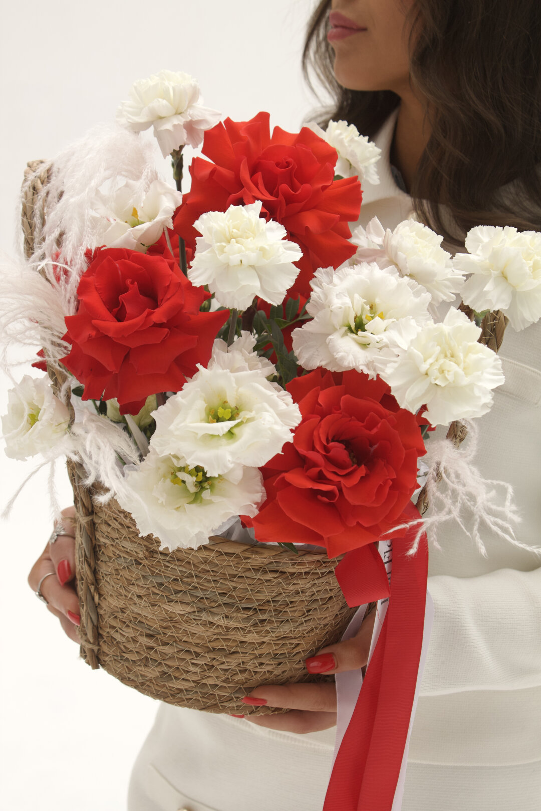 В милую корзину флористы поместили композицию «Радостная Рафаелла» за 7700₽, созданную в оттенках любимой конфеты. Нежность белой эустомы и диантусов разбавляется красным акцентом — французскими розами. Выражение любви, которым точно захочется похвастаться в социальных сетях!