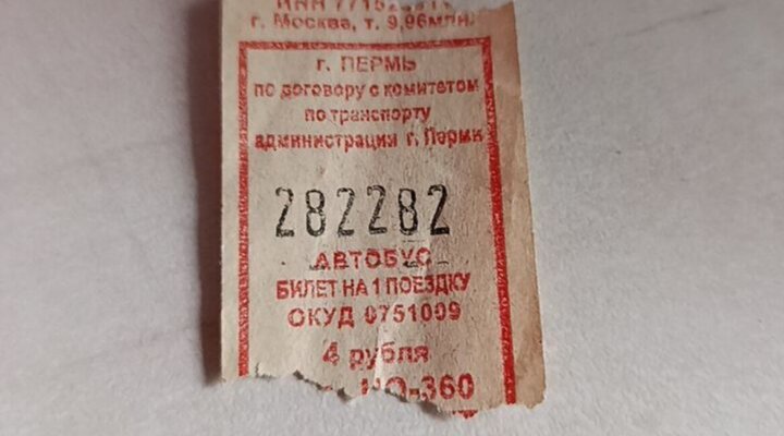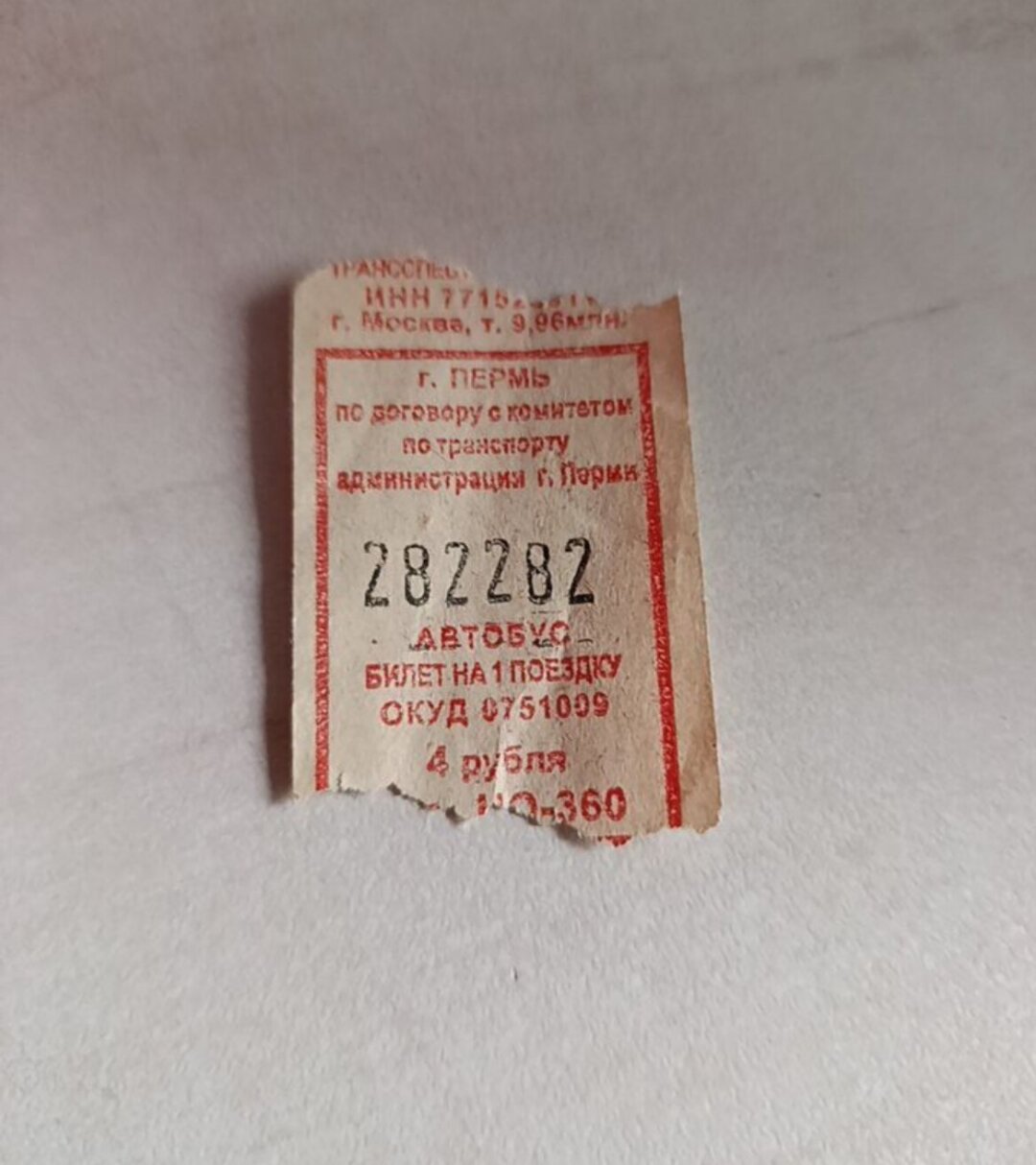 На автобусном билете — зеркальное отображение цифр 282, считающееся большой редкостью. По словам автора, билетик датируется примерно 2003-2004 годом. Подобные продаются на том же сайте и стоят гораздо дешевле: например, с цифрами 900009 готовы отдать за 50 тыс. рублей, а с 153351 — за 20 тыс.