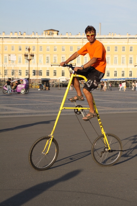 Я видел американца, который ездил по улицам без страховки на четырехметровом велосипеде. Кубинец делал пятиметровый велосипед, затем он же сделал 7,5 метров, но у него не получилось проехать – возникли какие-то технические проблемы. Однажды я видел попытку проехать на 13-метровом велосипеде, но уже через 20-30 метров слетает цепь, велосипед падает, бьется и ломается. Сам водитель повис на страховке в воздухе. А для «Книги рекордов Гинесса» необходимо преодолеть расстояние в сто метров.