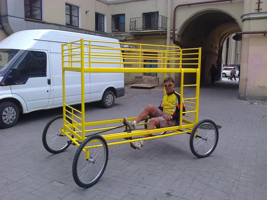 Я открывал велопрокаты в 1988-м в Паланге на Балтийском море – сделал пять трехместных веломобилей. Тем же занимался через год в Адлере. У веломобиля была удачная конструкция: одно управляемое колесо спереди и два «ведущих» сзади. Люди садились в ряд, а человек в центре рулил при помощи рычага. Затем наступили 1990-е: стало не до велосипедов или веломобилей, поэтому я толком ничего не конструировал.
