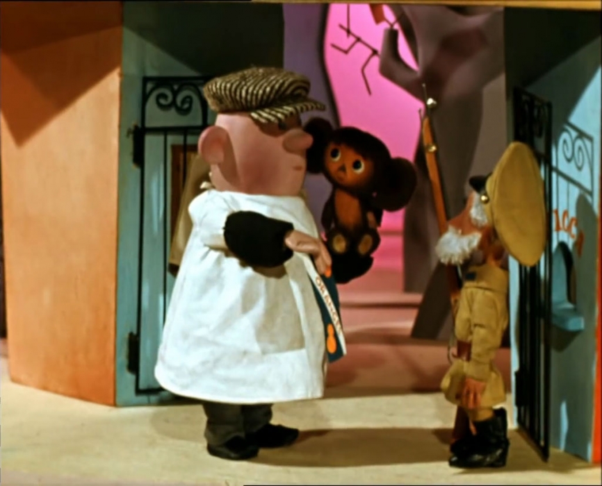 Вместо паспорта или других необходимых документов, он приходит с кусочком бумаги, в которую были завернуты апельсины (Чебурашка ведь «полумедведь, полуапельсин»). По замыслу создателей, такой «паспорт» для безродного героя точно найдет отклик в сердцах тех граждан СССР, у которых в настоящих паспортах в графе национальность значилось «еврей».
