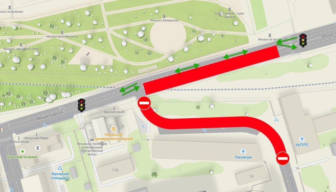 На первом этапе движение по путепроводу на улице Монастырская от 25 Октября до Монастырской, 2Б (БЦ «Магнат») сделают реверсивным. На участке будет работать светофор, который будет пускать транспорт по одной полосе. Проезд со стороны Максима Горького закроют полностью. На втором этапе перекроют движение со стороны улицы 25 Октября, а со стороны Максима Горького, напротив, откроют.