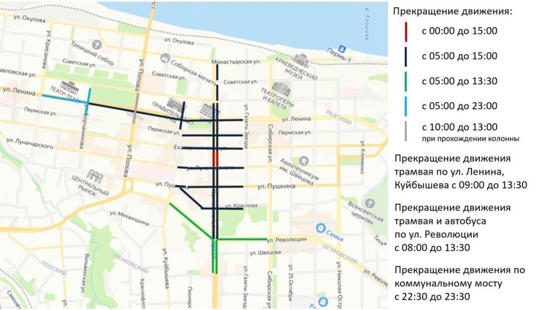 9 мая с 00:00 до 15:00 запретят проезд по Октябрьской площади, с 5:00 до 23:00 закроют улицы Ленина (от Борчанинова до Крисанова) и Борчанинова (от Петропавловской до Пермской) для всех видов транспорта, кроме трамваев.