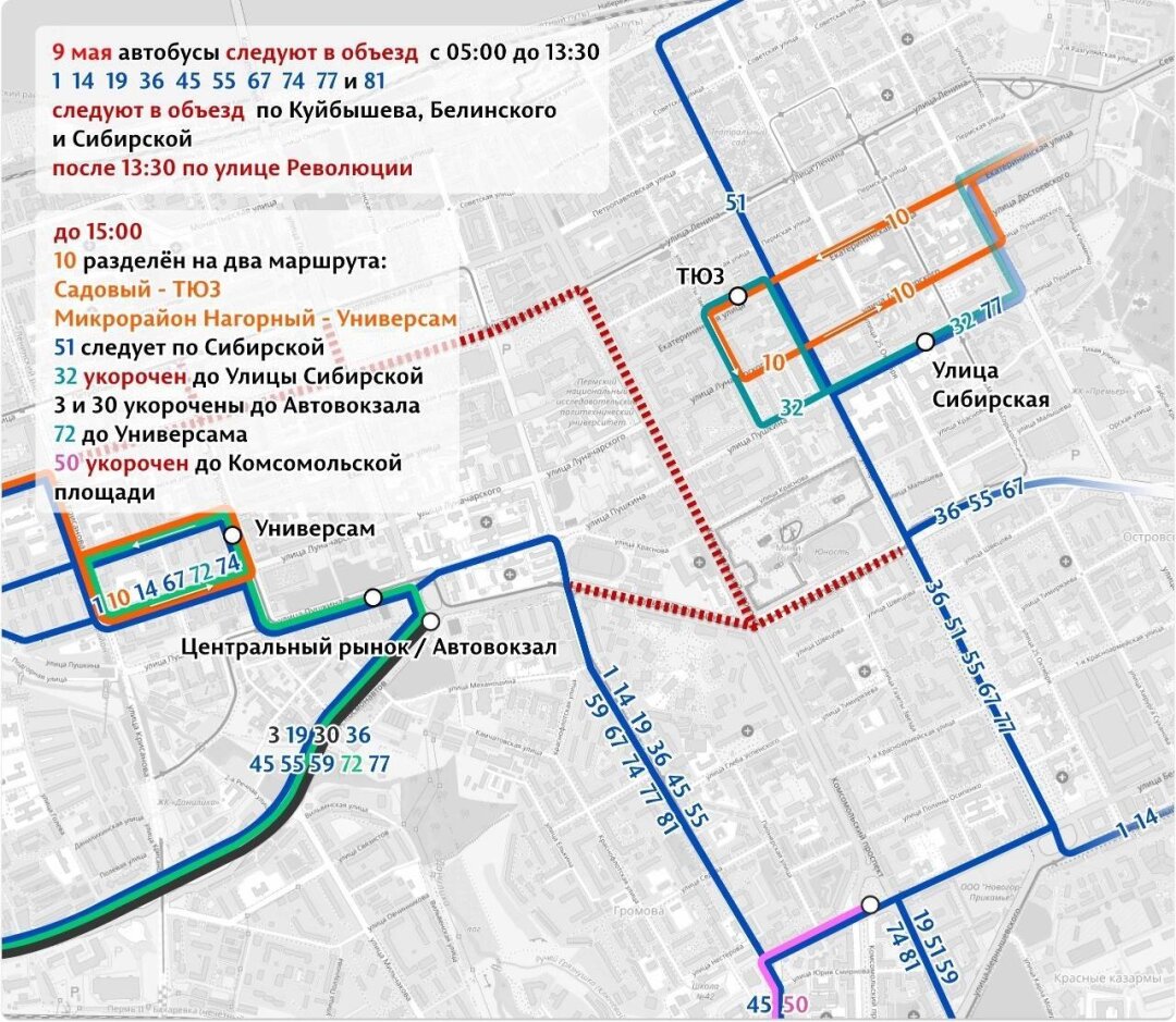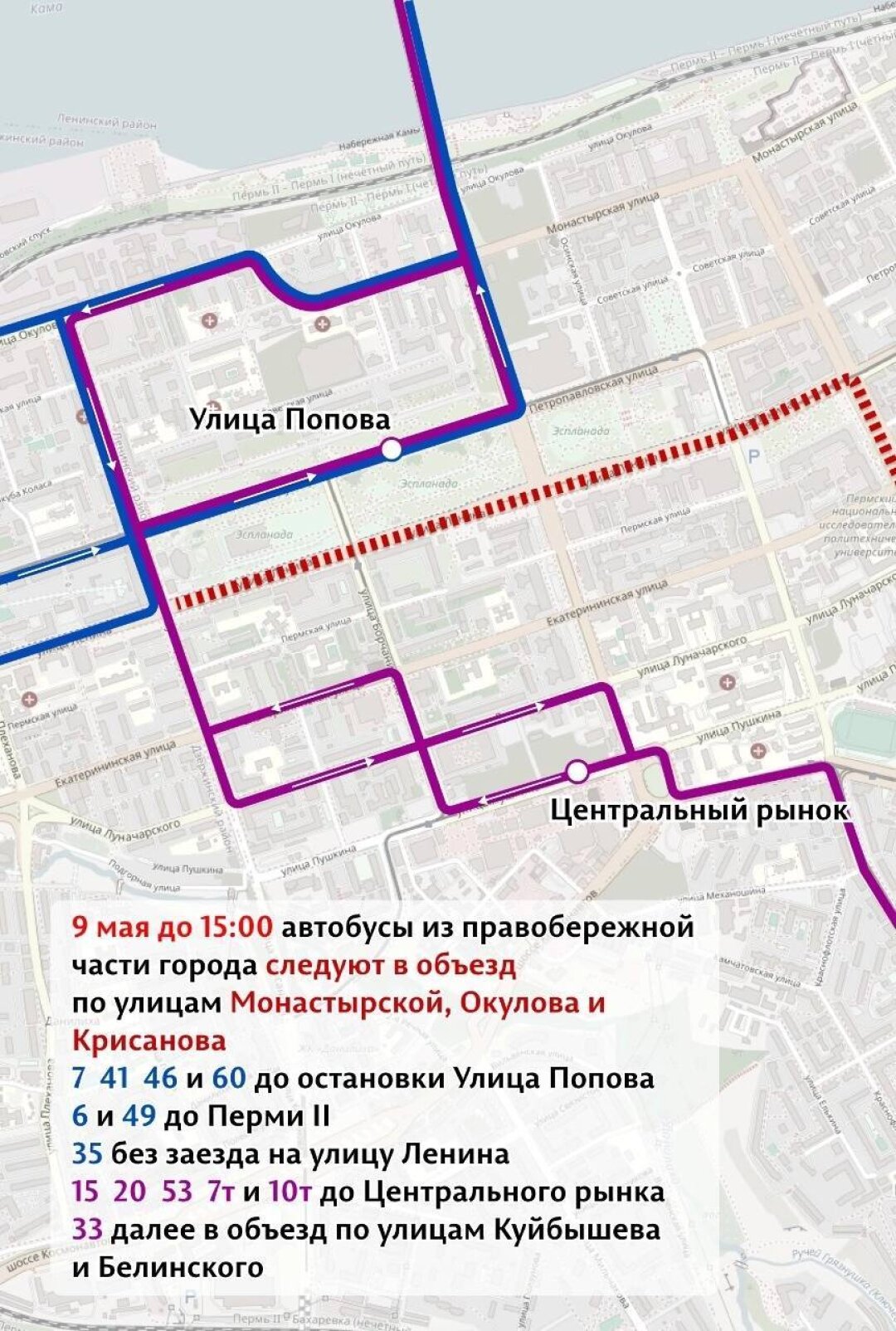 В пресс-службе администрации Перми рассказали, что с 5:00 до 13:00 автобусы №1, 14, 19, 36, 45, 55, 59, 67, 74, 77, 81 пойдут в объезд по улицам Куйбышева, Белинского и Сибирской. После 13:30 их перенаправят на улицу Революции. До 15:00 №51 будет ходить по улице Сибирская вместо Комсомольского проспекта.