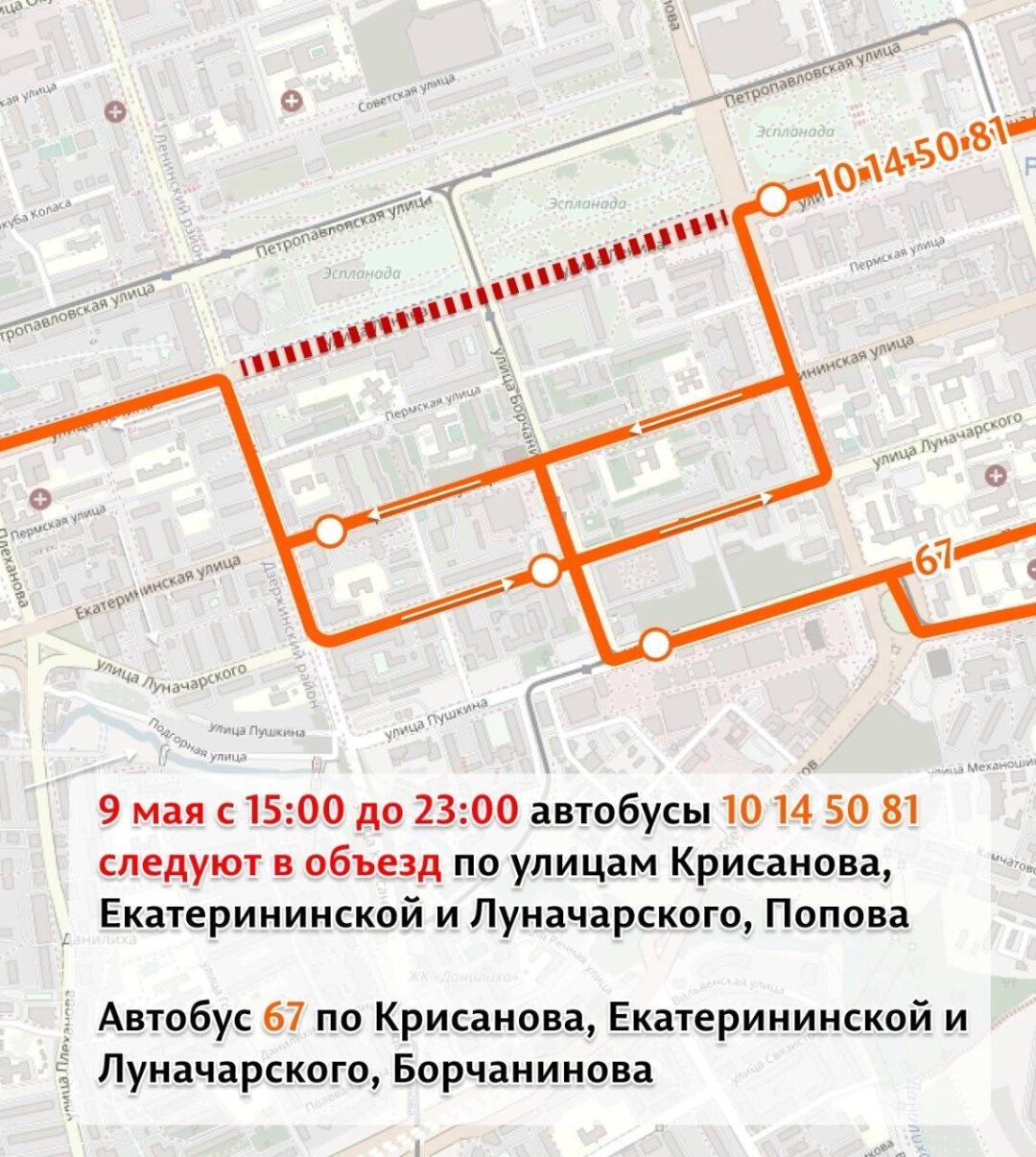 - №10, 14, 50 и 81 будут объезжать перекрытый участок по Крисанова, Екатерининской/Луначарского и Попова.