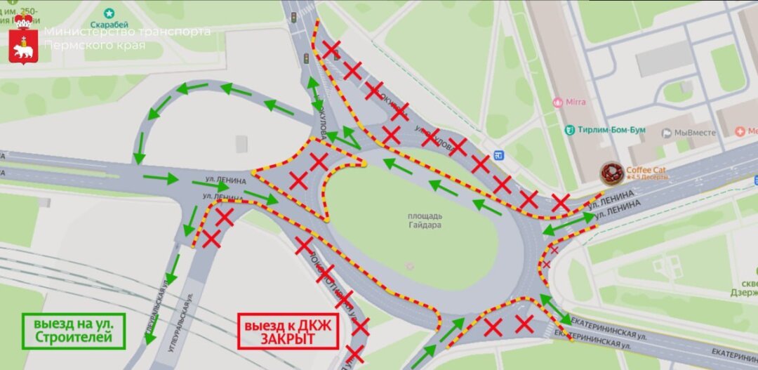 Схема проезда по кольцу на площади Гайдара с 11 августа меняется. В пресс-службе министерства транспорта Пермского края объяснили, что один из тоннелей на улице Локомотивная (в сторону ДКЖ) закрыли — это необходимо для дальнейших работ по реконструкции площади Гайдара.