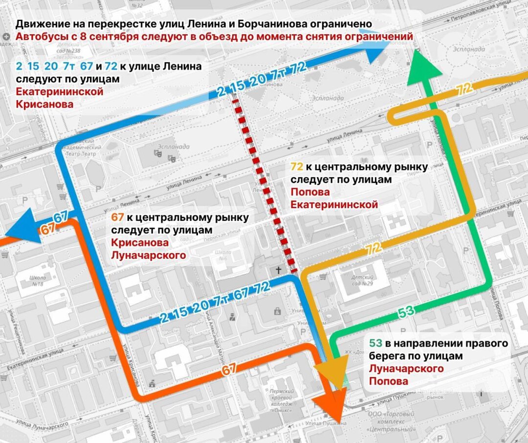 В пресс-службе администрации Перми рассказали, что из-за перекрытия участка улицы Борчанинова изменятся схемы движения нескольких автобусов. В направлении улицы Ленина маршруты № 2, 15, 20, 67, 72 и 7т пойдут по улицам Екатерининской и Крисанова, №53 — по Луначарского и Попова. В сторону Центрального рынка №67 проследует по улицам Крисанова и Луначарского, №72 — по Попова и Екатерининской, №5 и 11 идут без изменений.