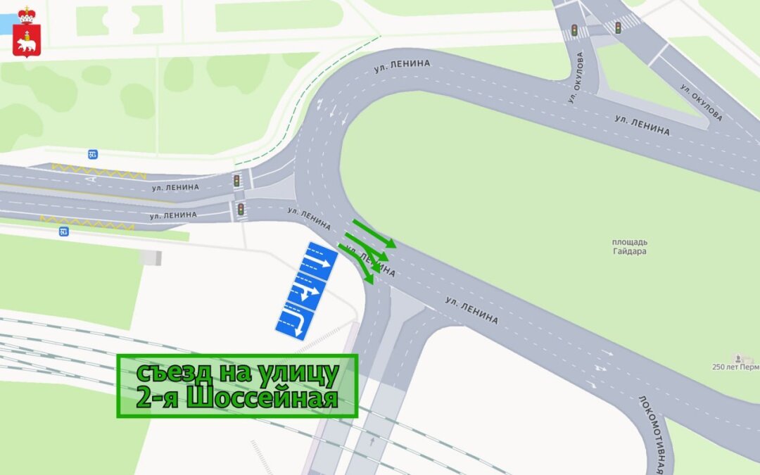 С 27 января изменится схема движения на площади Гайдара в Перми. Поворачивать на улицу 2-ю Шоссейную (в сторону улицы Строителей) можно будет с двух полос — средней и правой.