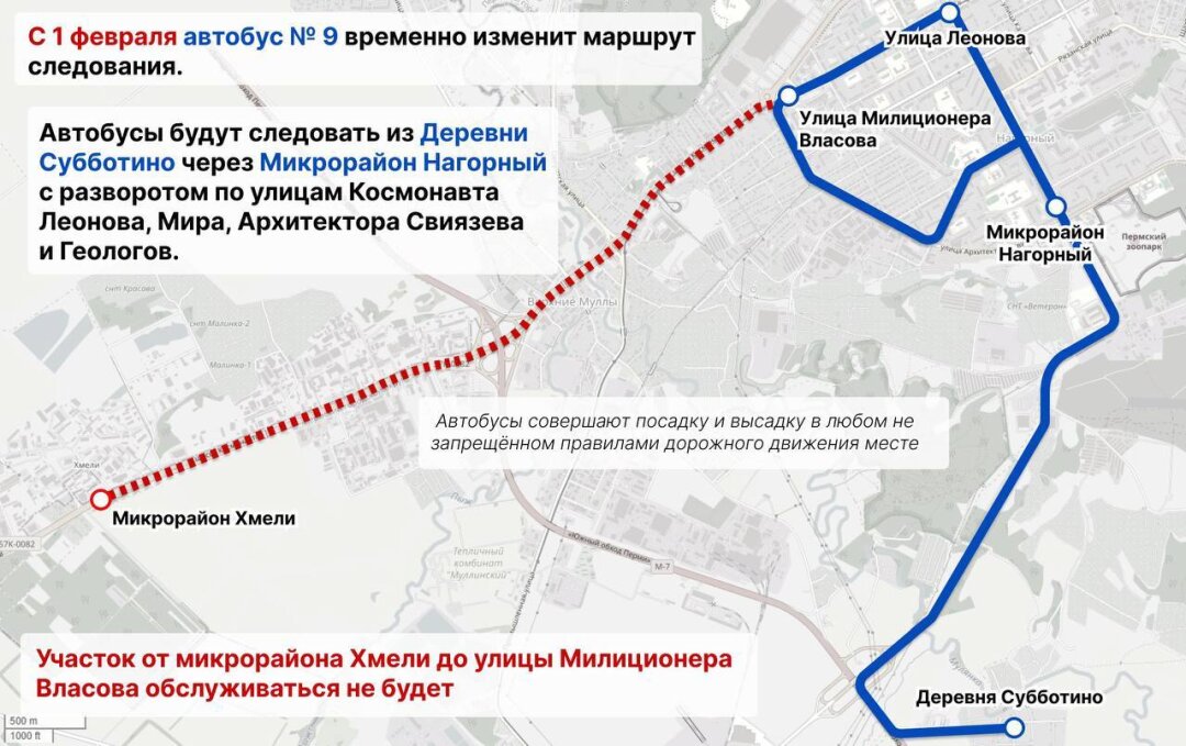 Маршрут №9 перестанет заезжать в микрорайон Хмели и будет отправляться из деревни Субботино. Разворотные пункты будут находиться на улицах Космонавта Леонова, Мира, Архитектора Свиязева и Геологов — это позволит увеличить частоту движения и сократить время ожидания для школьников. Маршруты №13 и №54, связывающие Хмели с другими районами города, останутся без изменений.