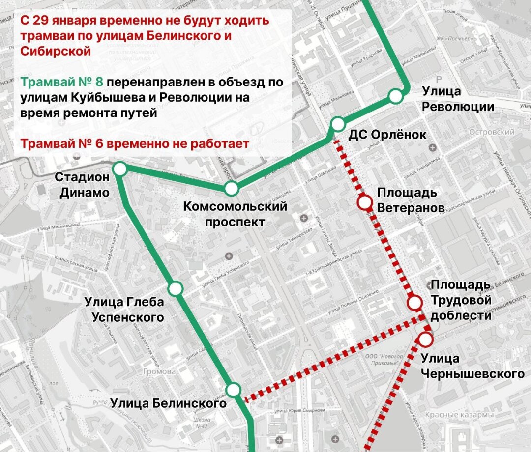 Работы синхронизированы с реконструкцией путей на улицах Чернышевского и Белинского. Это позволит полностью заменить трамвайный узел на площади Трудовой доблести: там установят современные стрелочные переводы, которые ускорят движение вагонов.