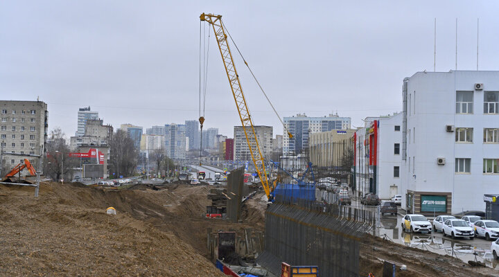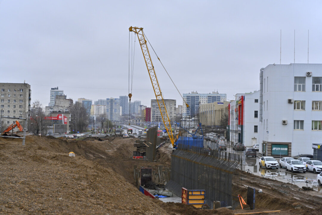 Демонтаж старого путепровода на шоссе Космонавтов почти завершен: убраны асфальтовое покрытие и балки пролетных строений, осталось только убрать пять опор. Слева от «Мориона» продолжаются работы по формированию будущей дороги. Рабочие делают ливневую канализацию, возводят дорожное основание и ведут переустройство сетей водоснабжения.