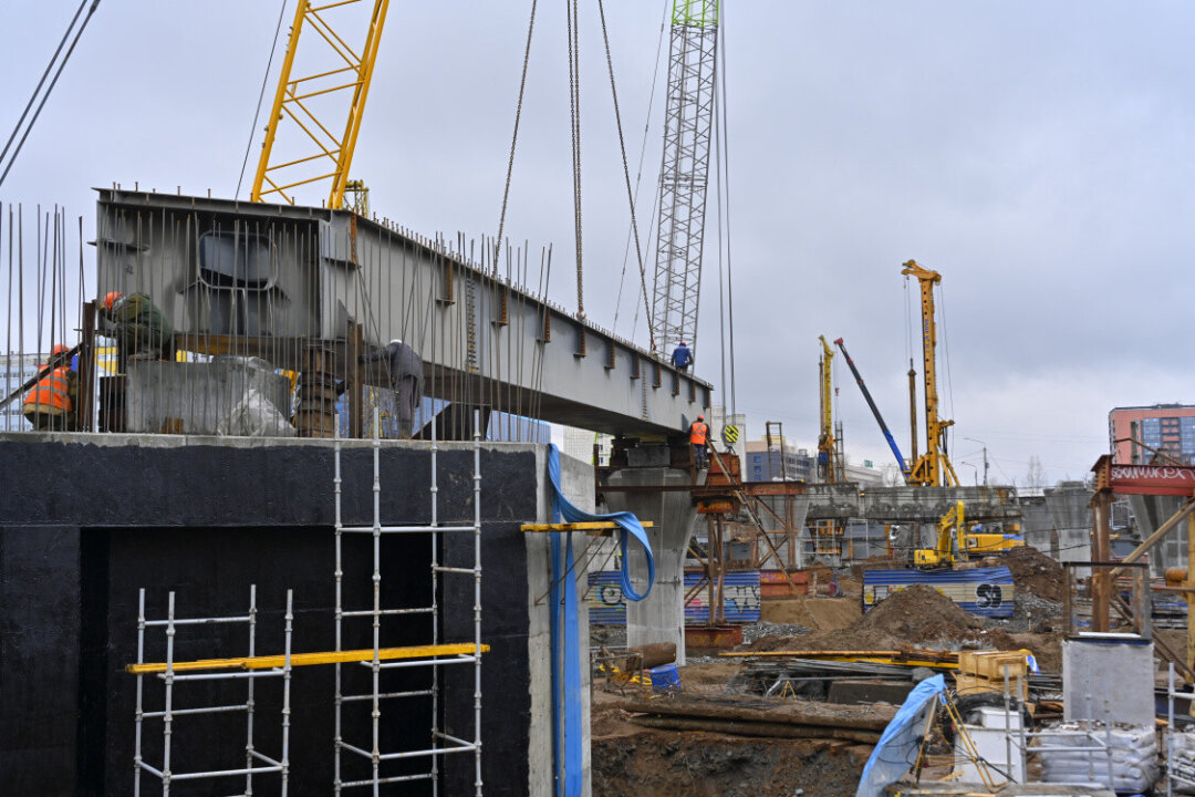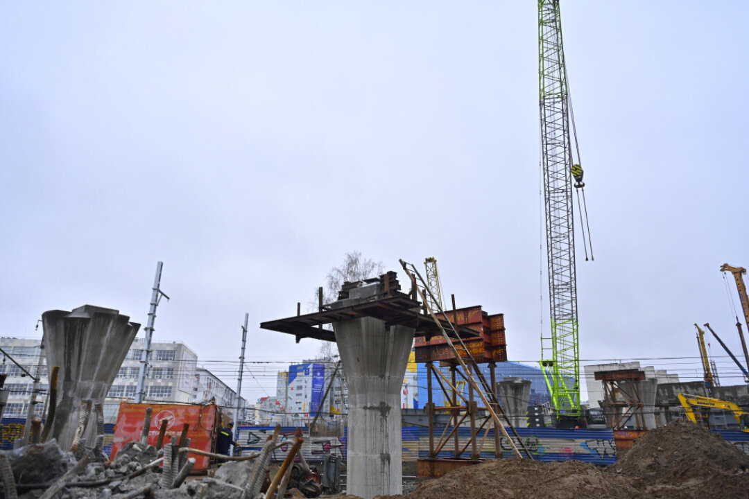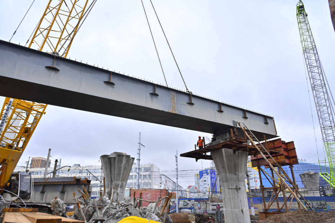 По данным пресс-службы министерства транспорта, забетонирована крайняя монолитная опора со стороны Центрального рынка, на нее уложили первые балки пролетных строений. Эта опора примыкает к насыпи подхода, где сейчас идет выемка грунта и устройство новой насыпи. Параллельно рабочие устраивают подпорные стены, уже готово свайное основание.