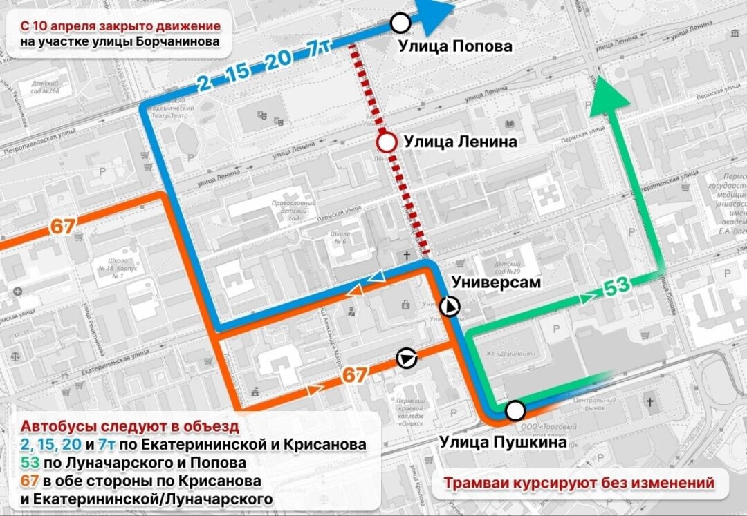 В Перми с 10 апреля изменится движение транспорта в районе улицы Борчанинова. Они коснутся шести маршрутов. Напомним, участок улицы закрыли до 16 июня из-за проведения ремонта.