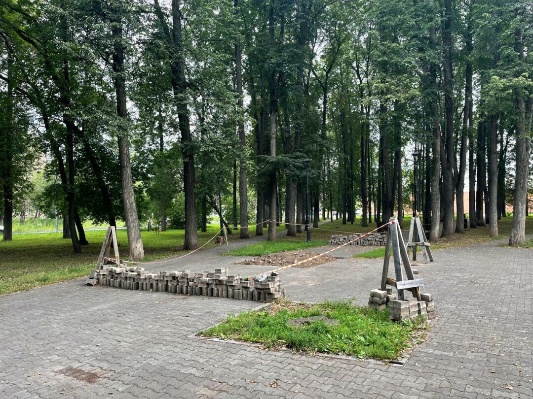 На месте, где установят памятник, сняли плитку, ранее там проходили археологические раскопки. Сейчас территория огорожена.