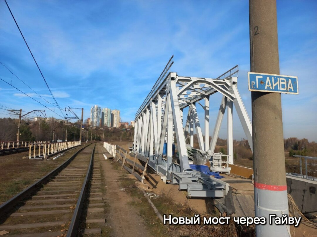 На правом берегу появился ж/д мост через Гайву, он соединит эстакадный подход моста через Каму со станции Кабельная. Параллельно на ней реконструируют ж/д пути контактную сеть.