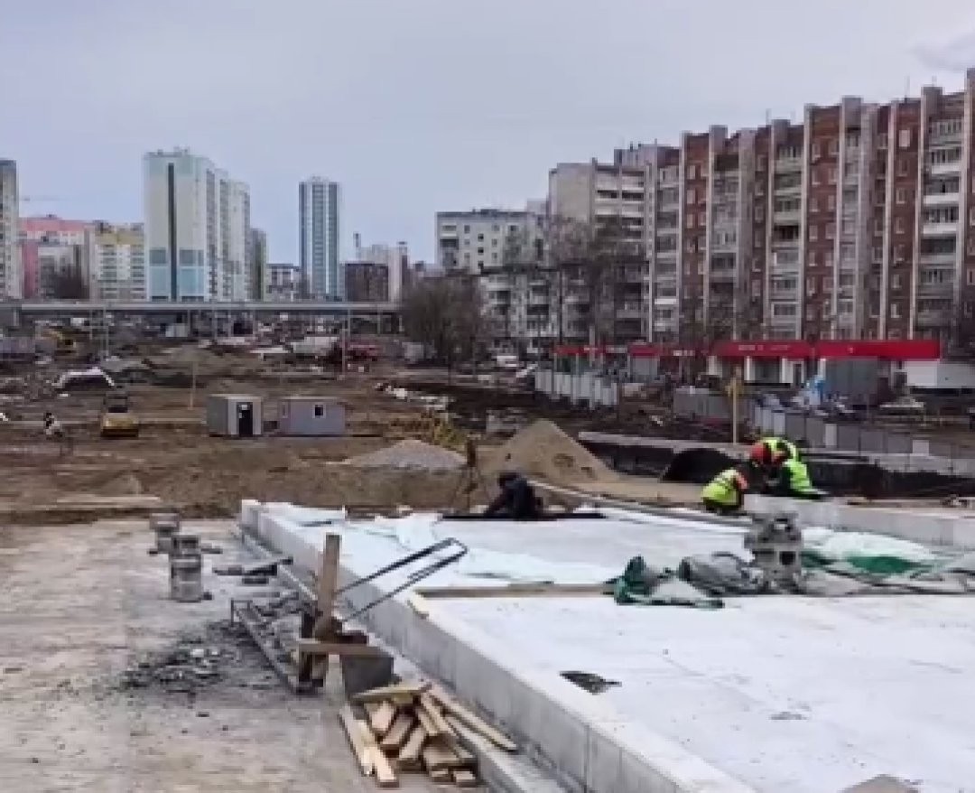 Стало известно, что происходит на стройплощадке путепровода на улице Крисанова. Сейчас рабочие приступили к укладке трамвайного полотна.