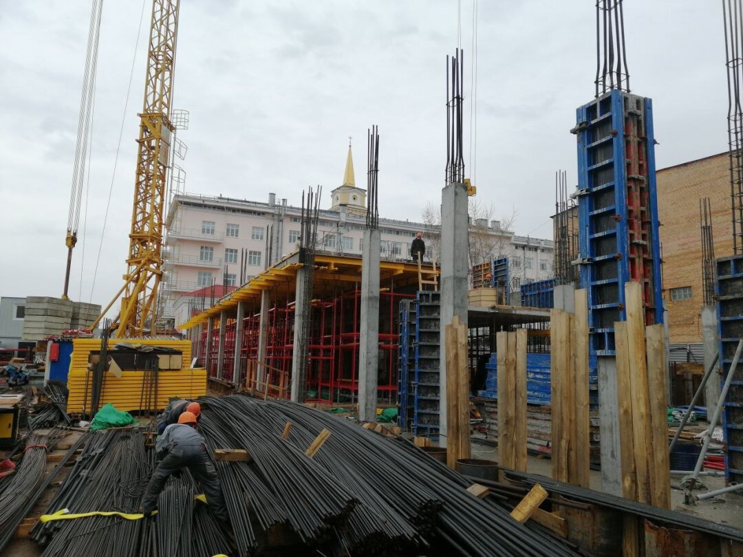 На стройплощадке, где бывший корпус ВКИУ реконструируют в четырехзвездочную гостиницу, начинают новый этап работ. Генеральный подряд заканчивает устройство монолитного перекрытия подвала.