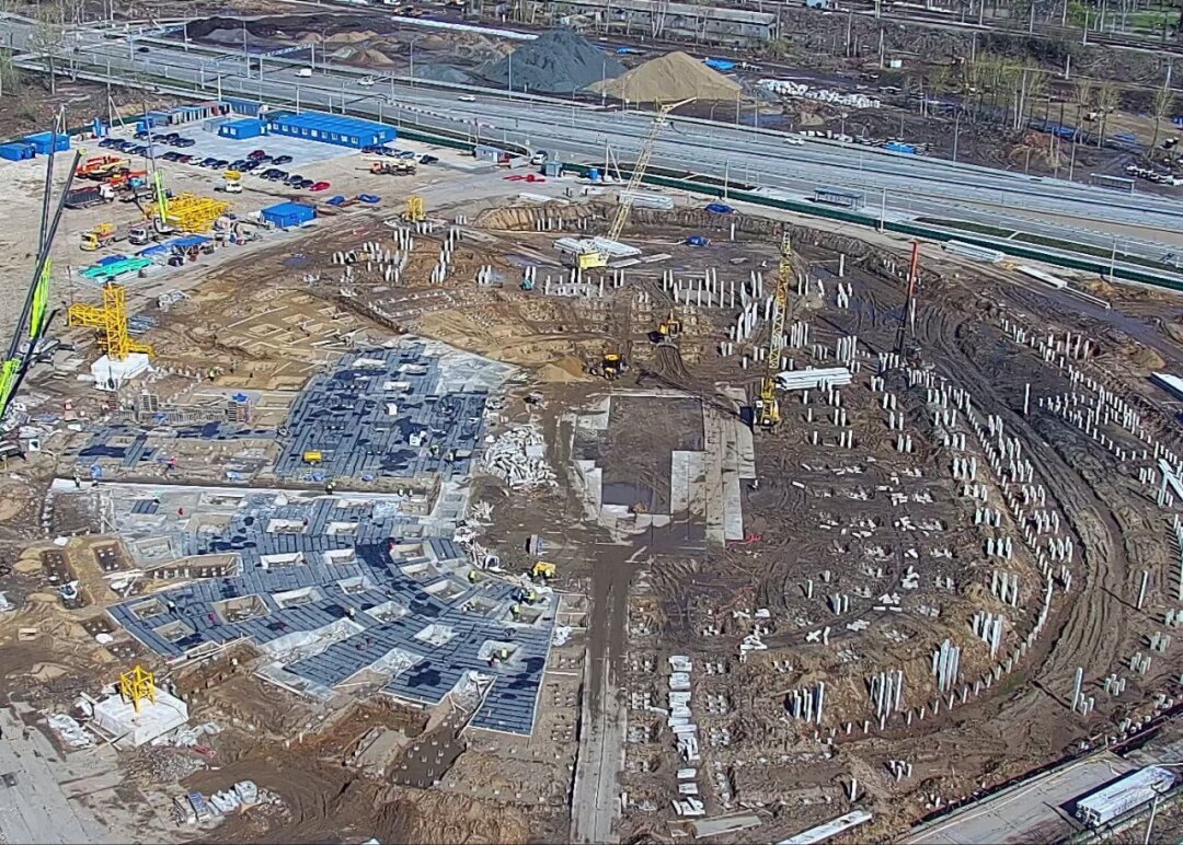 Масштабные работы по возведению многофункциональной спортивной арены в районе ДКЖ в Перми продолжается. На строительной площадке начали устанавливать башенные краны.