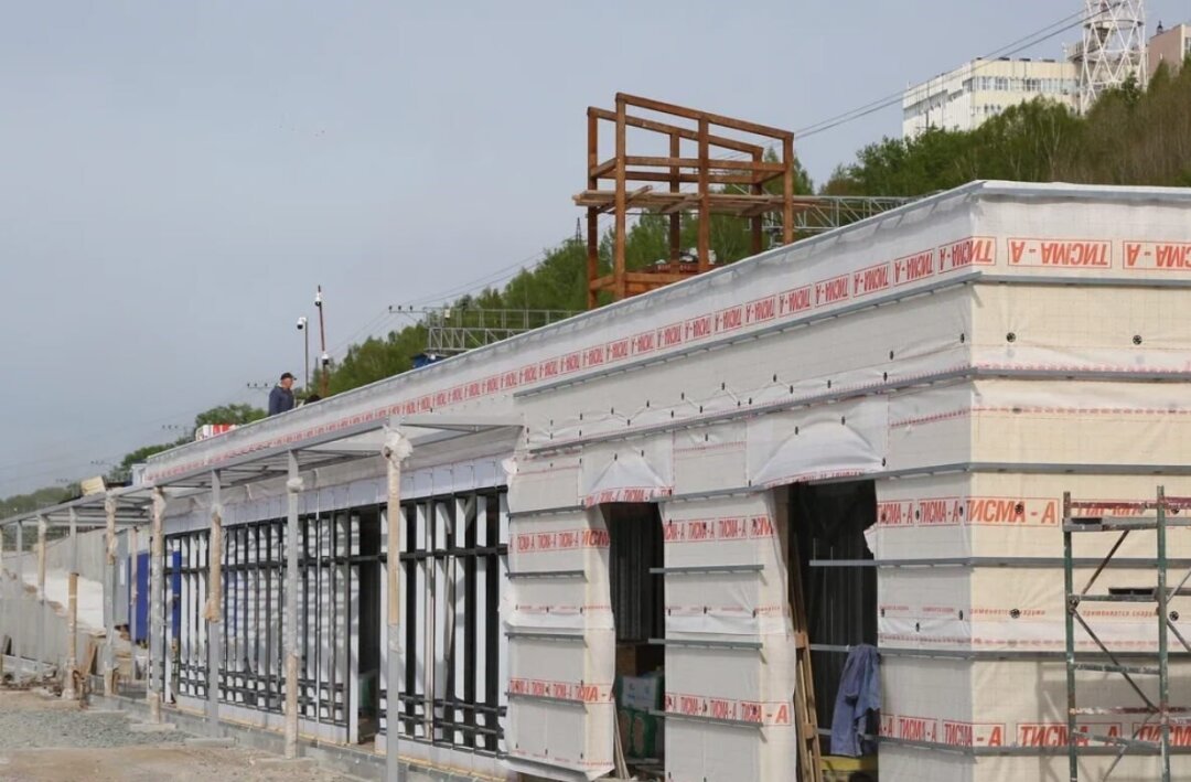 Новый участок набережной планируют сдать в 2025 году. Уже закончено берегоукрепление, в том числе лестничные сходы и подпорные стены, и организована пляжная зона. Работы ведут параллельно на нескольких участках. Променадная зона готова на 466%. На участке с многофункциональным павильоном рабочие закончили красить все металлоконструкции, завершили отделку и сейчас монтируют кровельное покрытие.