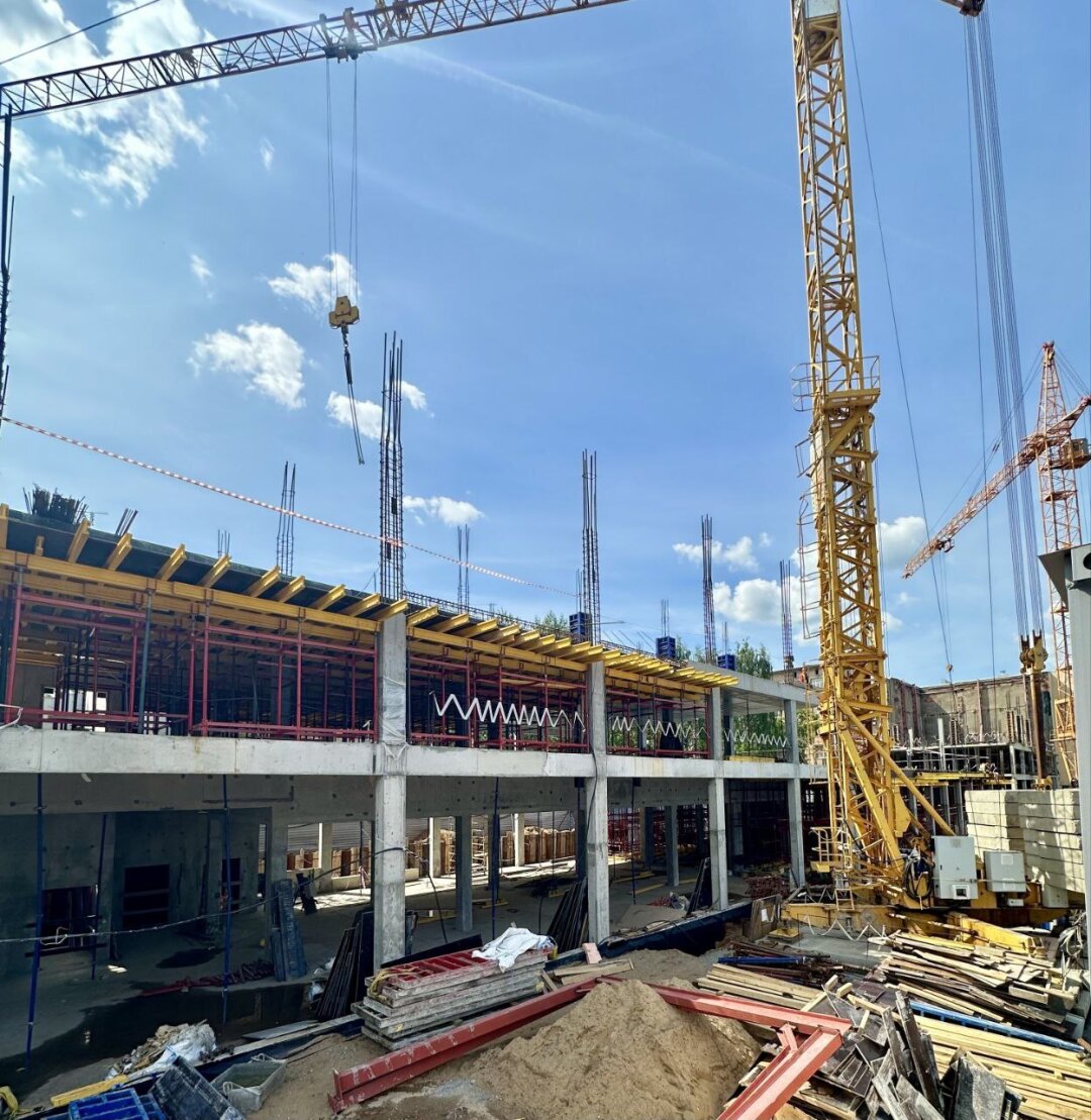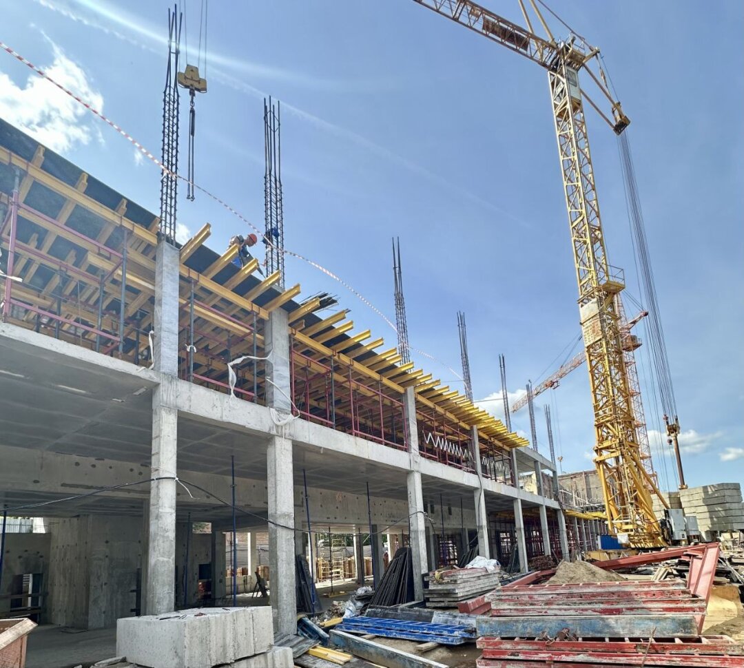 На стройплощадке, где бывший корпус ВКИУ реконструируют в гостиницу, заканчивают устройство монолитного каркаса первого этажа. Параллельно с этими работами ведется кладка наружных стен.