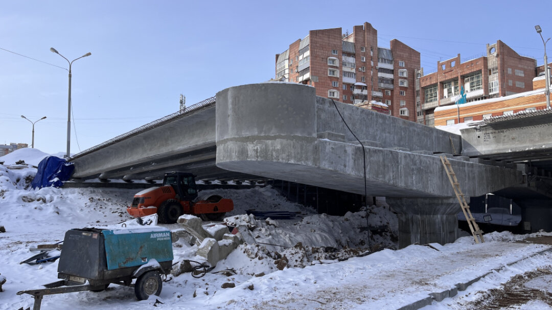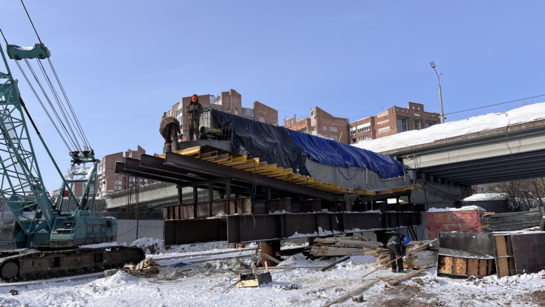 Между первой и второй опорами смонтировано пролетное строение из десяти балок. С наступлением тепла и после того, как рабочие возведут все опоры и смонтируют балки, стартует обустройство слоев мостового полотна: выравнивающий слой бетона, гидроизоляция, защитный слой и асфальтовое покрытие. Эти работы будут вести по пролетам.