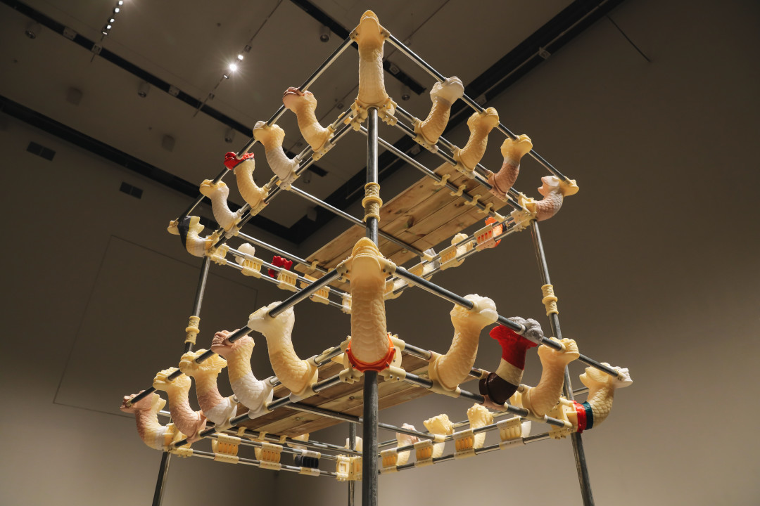Одной из самых сложных в сборке был «Культ красоты» Даин Пак — координирование процесса происходило в zoom с художницей, само собой. Южная Корея давно занимает первое место в мире по количеству пластических операций на душу населения, которые стали традиционным подарком молодым девушкам от родителей. Здесь художница овеществляет метафору культа и заменяет ее реально существующим ритуалом, в котором для успеха начинания необходимо положить в рот свиной головы деньги.