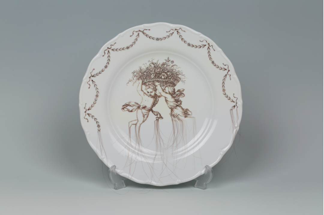Но главной ошибкой посетителя будет пропустить нежнейший фарфор Сэгён Ли, который только кажется поначалу инородным вторжением среди тревожного видео-арта. Художница работает с традиционными узорами Мейсенского фарфорового завода, воплощением консервативного эстетизма, но выкладывает эти рисунки из человеческих волос. Это, вроде бы, должно снизить регистр восприятия и превратить очаровательные белые тарелочки в «неприятный объект»; но каким-то образом эти тщательно уложенные узоры добавляют обаяния и напоминают о викторианских причудливых увлечениях волосами и другими странными, на наш вкус, проявлениями телесности. И в этом вся многозначность корейского искусства – как только тебе кажется, что ты понял, про что это все, так тут же оно как бы изворачивается в руках и не дает уложить себя в простые стереотипы.