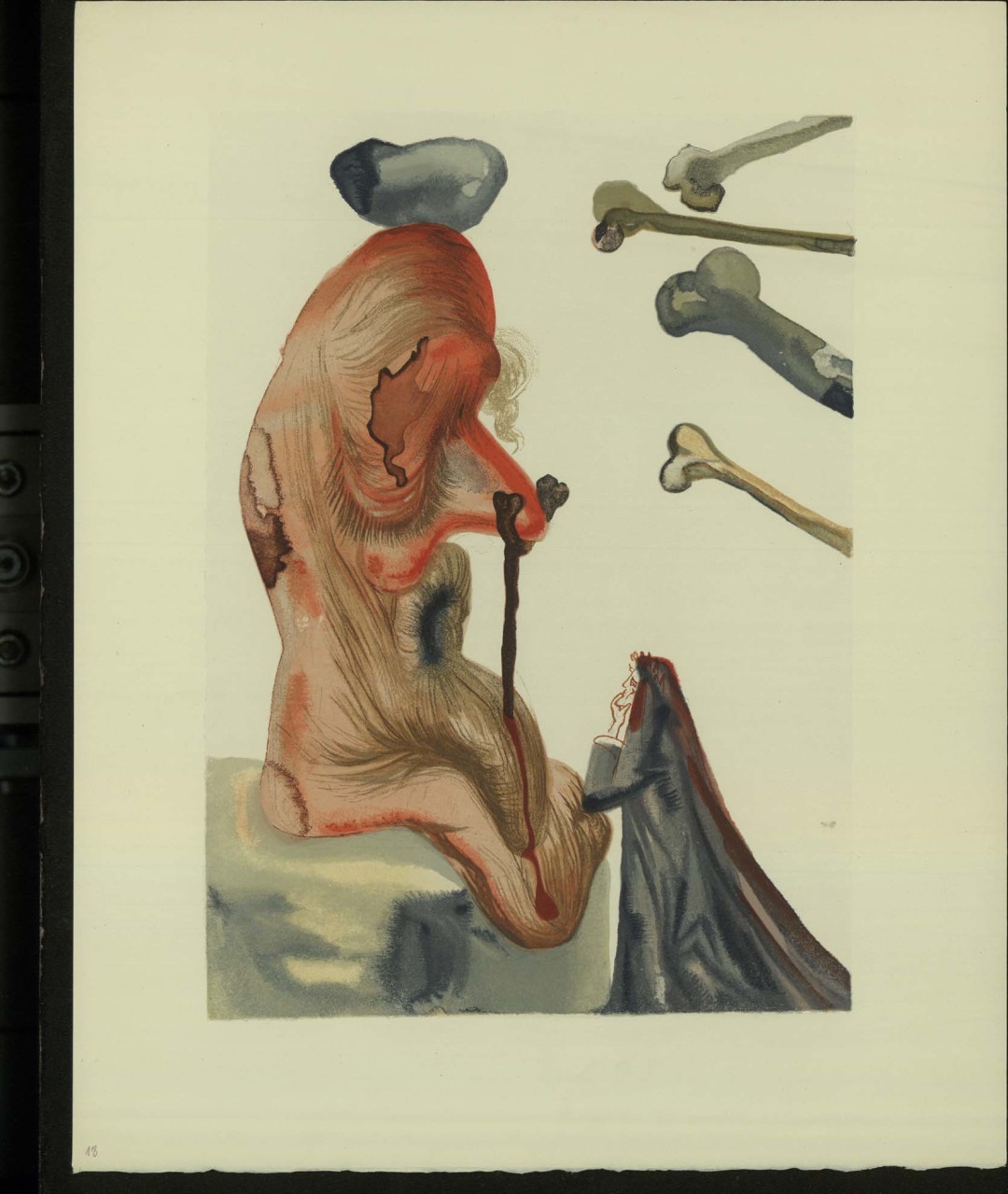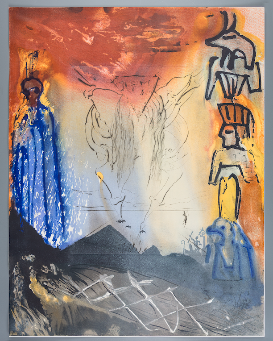 «Далинизировать» — глагол, который используют кураторы выставки Михаил Балан и Юлия Лукьянова, оценивая подход Дали к жанру, имея в виду, что художник захватывает своей мифологией всю предоставленную ему территорию. Он верен своему типу образности: пасхалки в виде «параноидально-критических камамберов времени и пространства» (или, по-простому, текучих часов), ядерного мистицизма и фрейдистских символов он расставляет даже в иллюстрациях к «Божественной комедии» Данте. Не ставя под сомнение оценку специалистов отдела западноевропейского искусства, я предлагаю еще один способ посмотреть на выставку — с литературоведческой точки зрения.