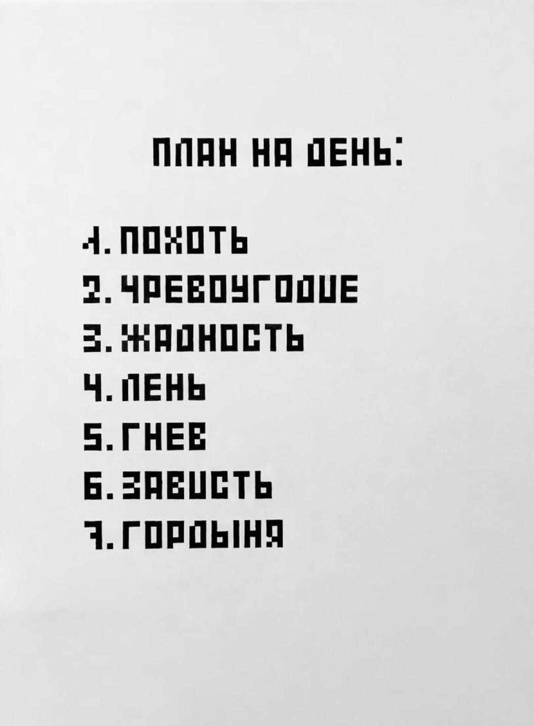Другой любопытный лот это работа участника петербургских Паразитов — мастер пиксель-арта Иван Тузов в этот раз перенес из диджитал измерения в материальное пространство холста ироничный «План на день» 2024 года. На 8-битном экране мотиватор из 7 смертных грехов: «Помимо приятных вещей, которые я делаю за день: работа, забота — поймал себя на мысли, что еще я грешу и не могу не бороться с этим. Получилось такое недосказанное высказывание», — признается художник.