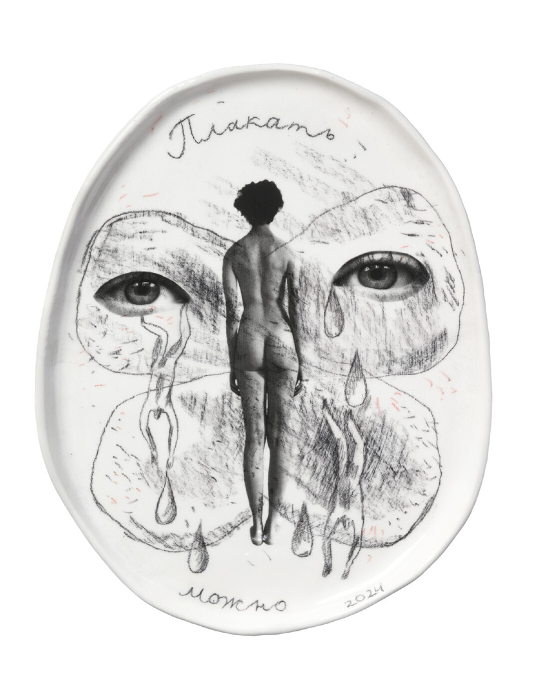 Помимо живописи на аукционе также представлена керамика — прямиком от выпускницы Академии Штиглица Оксаны Афанасьевой. «Плакать можно» 2024 года — это лирическая смесь фотографий и графики сюрреалиста Мен Рея и «дневниковых» записей о человеческих эмоциях.