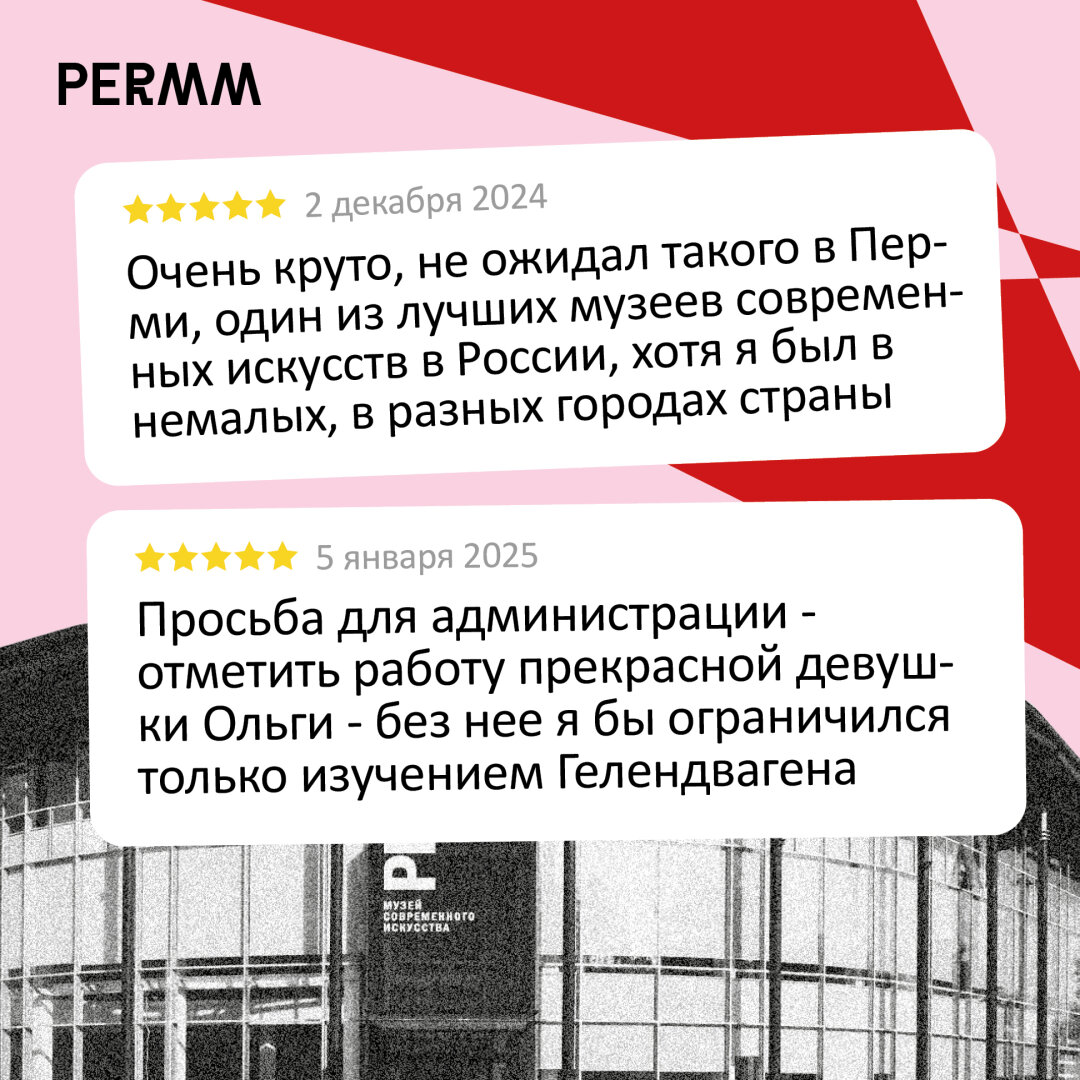 ПЕРММ в октябре 2023 года переехал в новое современное пространство. А совсем недавно сменил айдентику и логотип: обновление подчеркивает стремление музея к современности и открытости. А Геледваген, он же инсталляция «Антиформа №15», хорош.